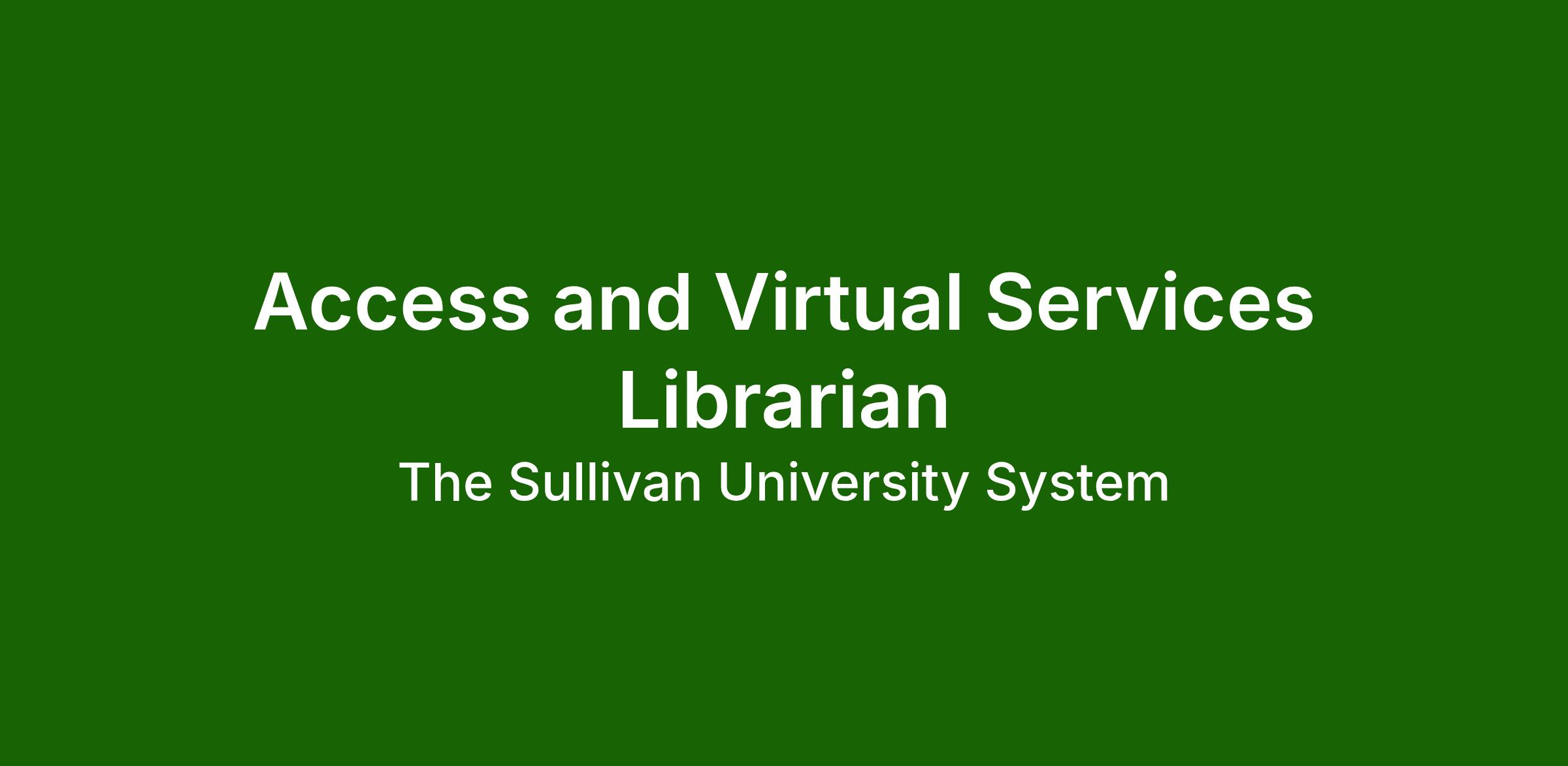 We are currently looking for a full-time Access and Virtual Services Librarian. The Access and Virtual Services Librarian (AVSL) position is a full-time professional academic librarian faculty position encompassing the responsibilities for all professional library reference and customer service duties as outlined below. Reporting to the Senior Director of University Libraries, the AVSL will have primary responsibility in three major areas. First, the AVSL will coordinate delivery of library access services, such as assisting patrons with circulation of materials, technology support, interlibrary loan, and intra-library delivery between Sullivan sites. Second, the AVSL will support virtual access and reference services, such as assisting patrons with accessing electronic formats, responding to inquiries, and other services. Finally, the AVSL will assist in managing the library collection, including assisting with selection, purchasing, and shelving physical library materials. This position is not tenure track and there is no expectation of teaching as instructor of record.