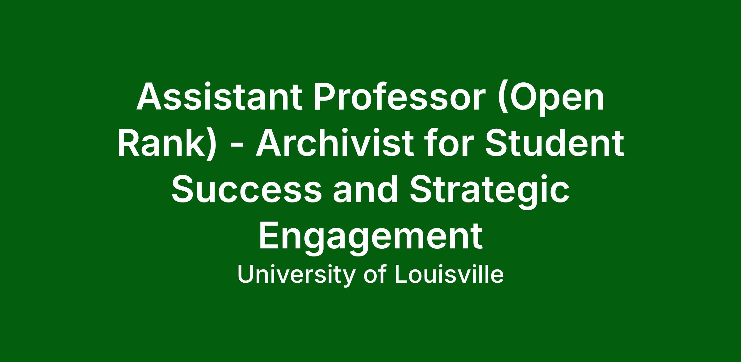 The University of Louisville Archives and Special Collections (ASC) library invites applications for a tenure-track faculty position to serve as Archivist for Student Success and Strategic Engagement. This individual will be responsible for leading ASC’s instruction program and developing engaged learning opportunities for students. They will lead ASC’s student success initiatives, particularly in the areas of student employment and collaborative programming with campus organizations. They will also play a role in promoting student success and faculty scholarship through the ThinkIR, the University of Louisville’s institutional repository.