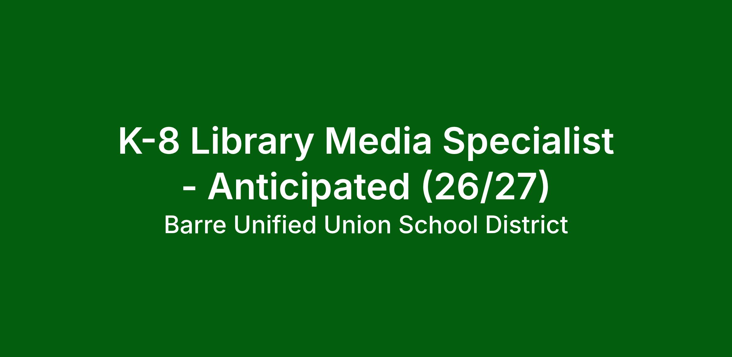 Barre City Elementary and Middle School seeks a dynamic and passionate K-8 Library Media Specialist to join its enthusiastic and dedicated team, beginning mid-August. We're looking for an innovative educator who can spark curiosity, nurture a lifelong love of reading, and equip students with the research and digital literacy skills they need to thrive in the modern world.