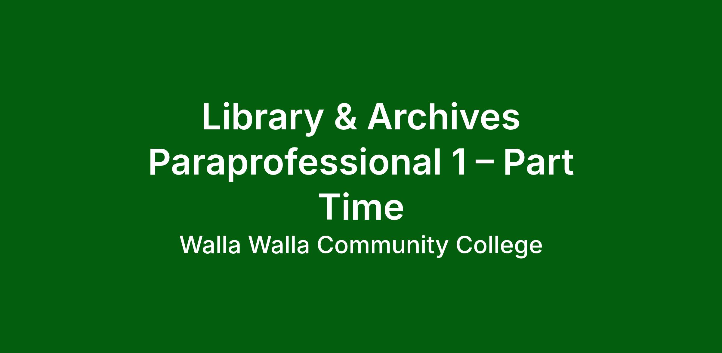 Walla Walla Community College is accepting applications to fill the part-time role of Library & Archives Paraprofessional 1 on the Walla Walla Campus.