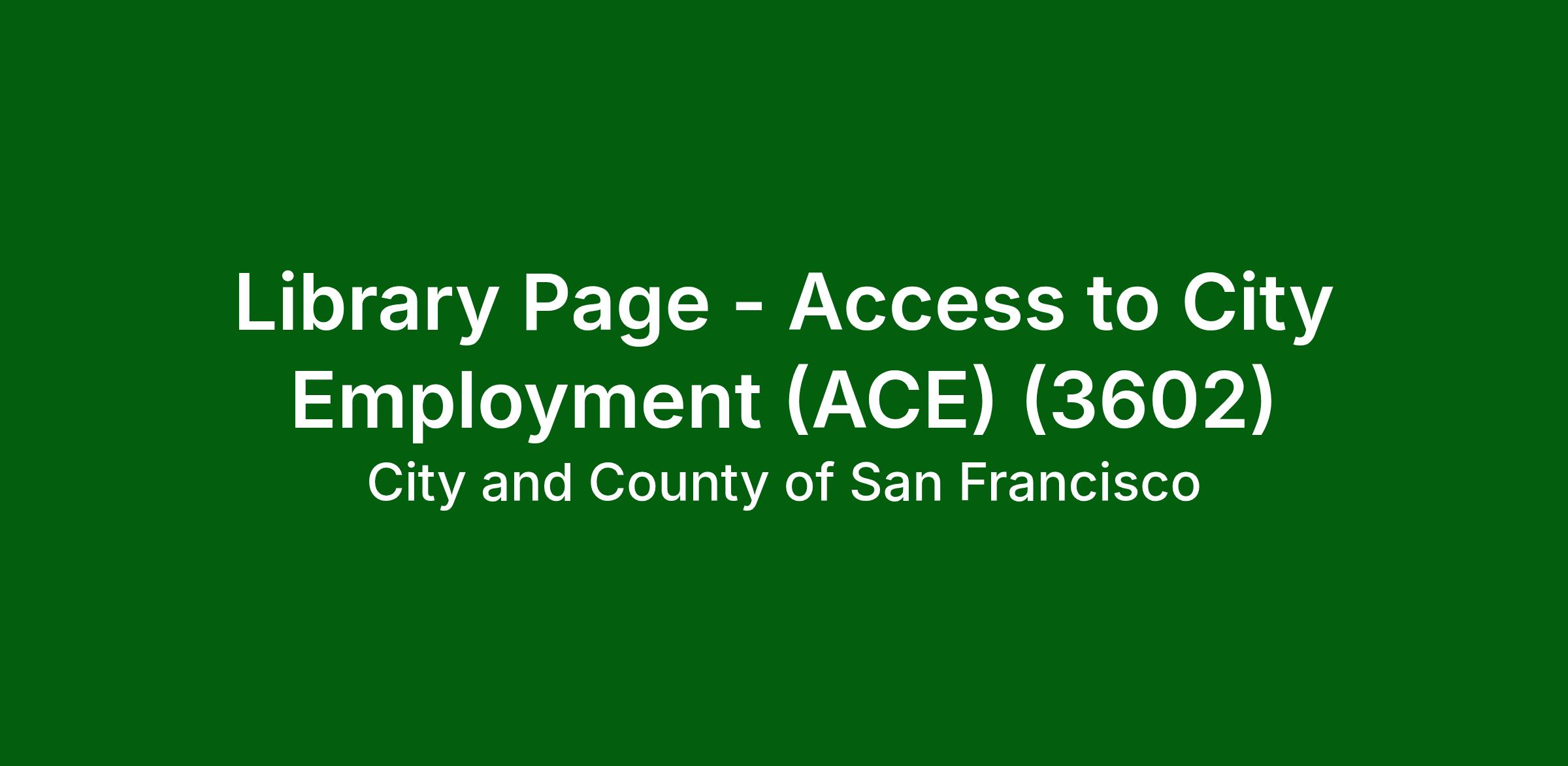 The Access to City Employment Program (ACE) seeks to hire qualified individuals with a disability into permanent entry-level jobs outside the normal civil service selection process. To be hired through the ACE Program, individuals must meet the minimum qualifications of the job and provide a Certification of Disability from the California Department of Rehabilitation or a Veterans Preference Letter from the U.S. Department of Veterans Affairs. To learn more about the Access to City Employment Program (ACE) requirement, please visit: https://careers.sf.gov/interest/access-city-employment/