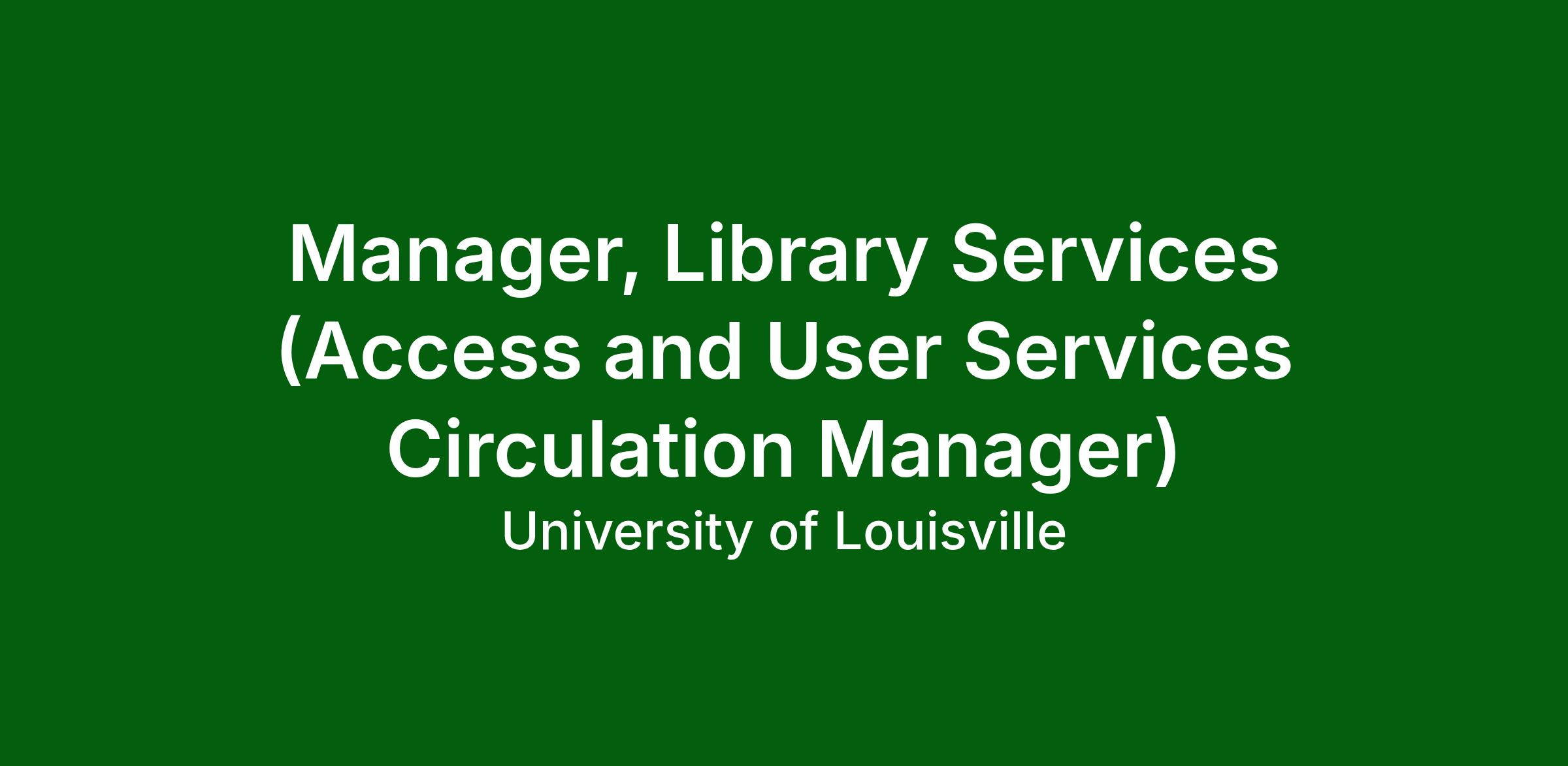 The Manager, Library Services for the University of Louisville will supervise the daily desk and backroom operations of the Access and User Services department, including managing circulation/access functions, scheduling department staff, and oversee services during department hours (including serving as emergency contact and shift back-up during night and weekend shifts).