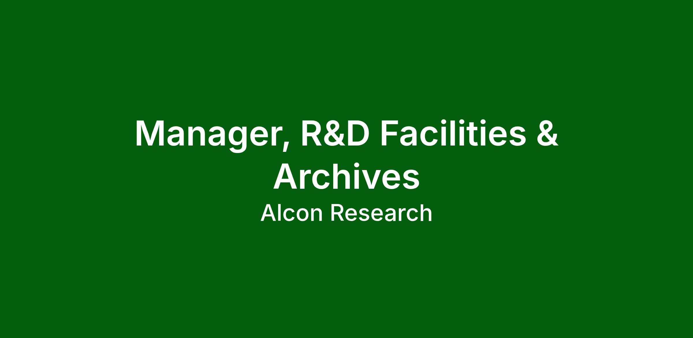 We foster an inclusive culture and are looking for diverse, talented people to join Alcon. The Manager, R&D Facilities and Archives, is primarily responsible for processes and teams in one or more of the following areas: Facilities Planning (e.g., space planning, facility infrastructure condition assessment, etc.) -Facilities Security (People/Facilities) -Planning maintenance programs for building and grounds of an organization including the upkeep of equipment and supplies -Coordinating contractors for projects where required -Overseeing the planning of space allocation and changes.