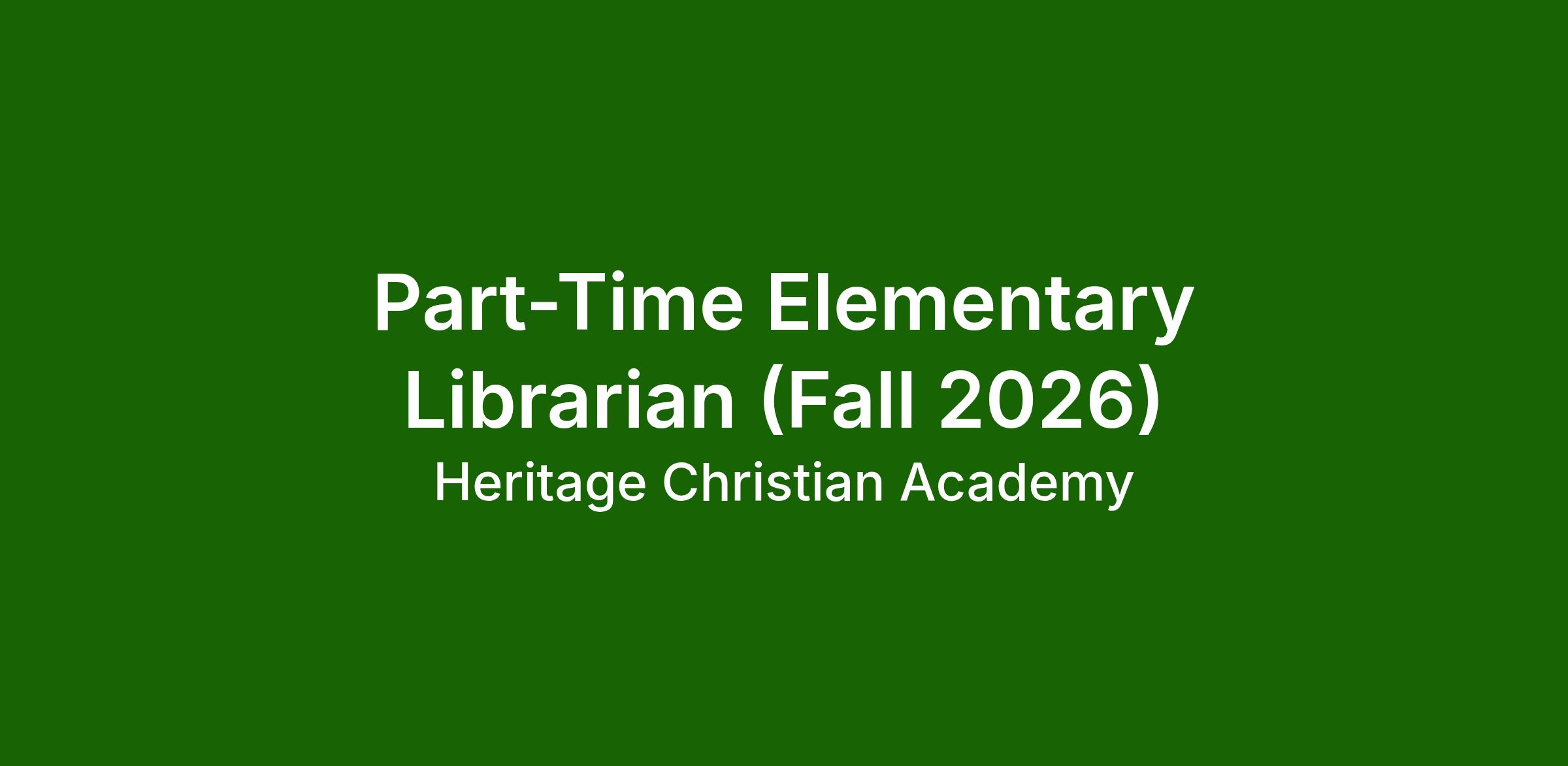 The Part-Time Elementary Librarian supports the academic mission of Heritage Christian Academy by managing the elementary library, promoting literacy, and assisting students and teachers in accessing age-appropriate resources. Responsibilities include maintaining the library collection, supporting classroom instruction through resource coordination, supervising student library use, and fostering a love of reading within a Christ-centered educational environment.