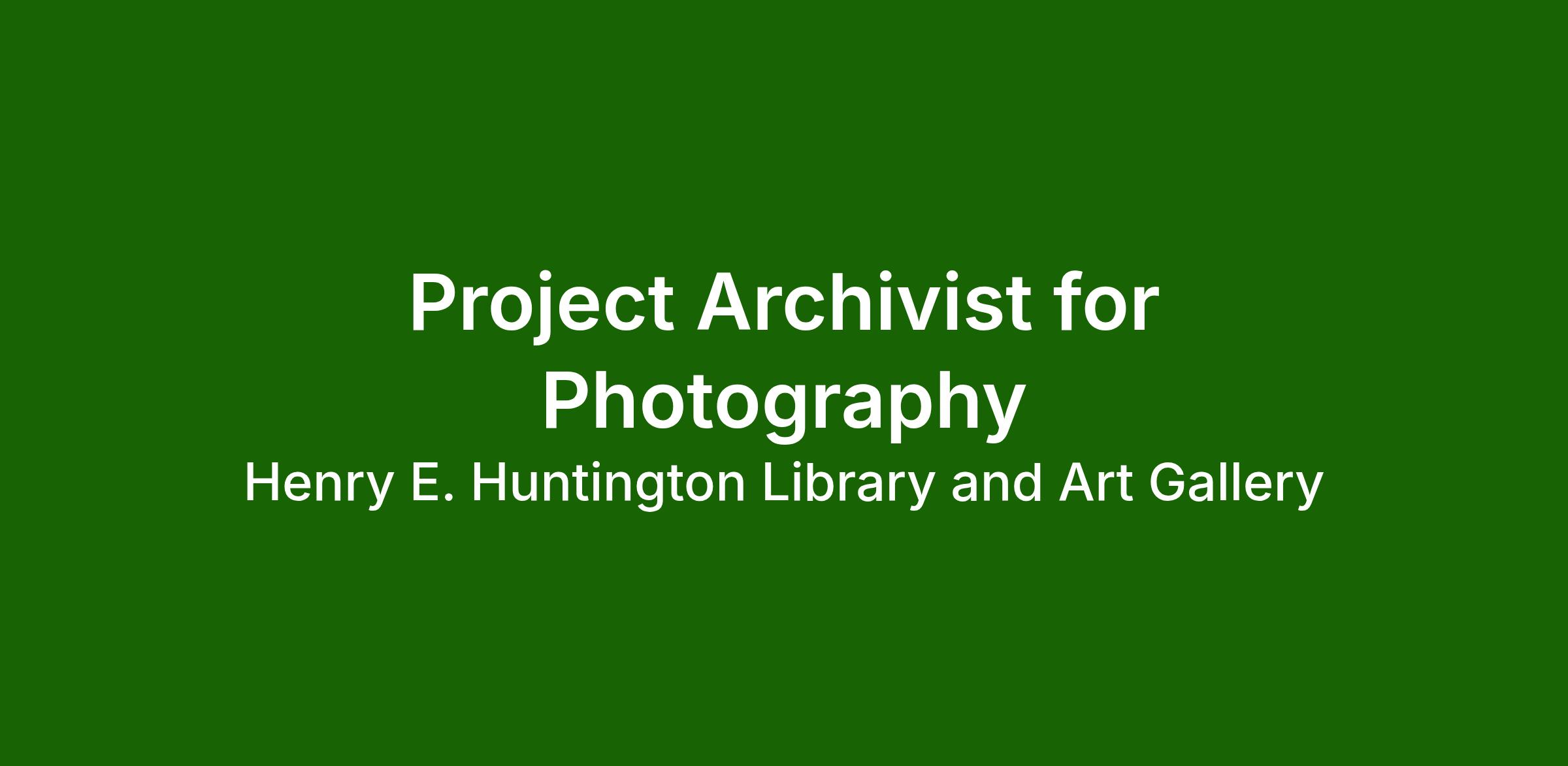 Working as part of the Technical Services Department, the Project Archivist for Photography will arrange, describe, and process photographic collections. The Huntington Library has extensive photographic holdings. The more than 800,000 photographs date from the 1850s to the present and include outstanding examples of a wide variety of print and negative processes and photographic formats. Photograph collections include historical, documentary, commercial, and fine art photography with special strengths in California and the American West, the American Civil War, Native American and Indigenous Peoples; and documentary photography within corporate and commercial archives.