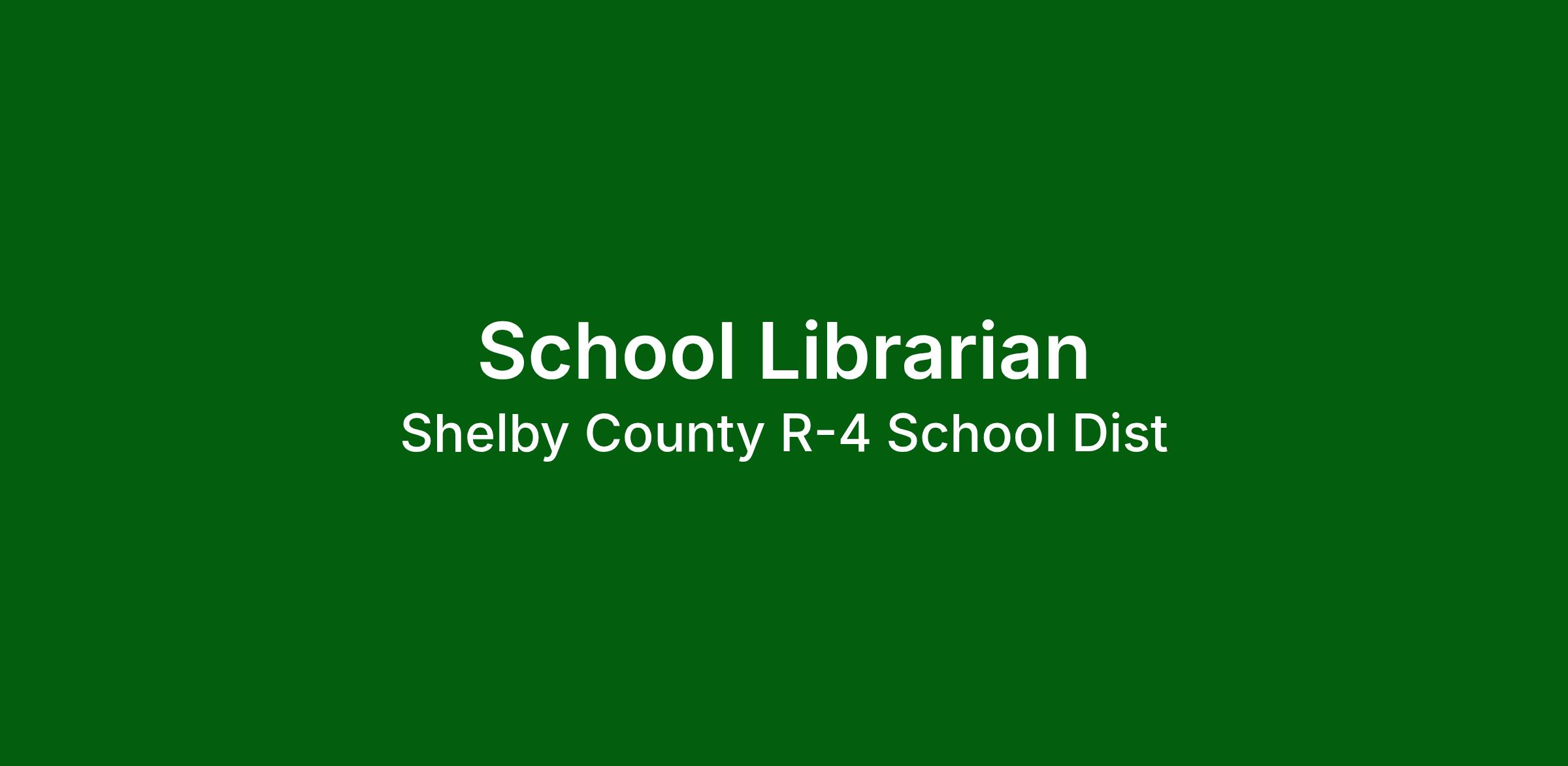 The Shelby County R-IV School District is seeking applicants for the position of School Librarian for the High School and Middle School for the 2026-2027 School Year. The District is seeking a highly motivated individual with the ability to help fulfill the District’s mission. This individual will be joining a team that is committed to high expectations and continuing the proud traditions of the Shelby County R-IV School District. Qualifications Educational Preparation: Requires Bachelor’s Degree in Education. Certification Requirements: Valid Missouri Teacher’s Certificate or ability to obtain proper certification. Interested Candidates can apply online through our website at www.cardinals.k12.mo.us and click on the Employment Tab "Apply to be a Cardinal" contact Mr. Tim Maddex, South Shelby High School Principal at tmaddex@cardinals.k12.mo.us or Mr. Curt Bowen, South Shelby Middle School Principal at cbowen@cardinals.k12.mo.us or call 573-588-4163 for more information.